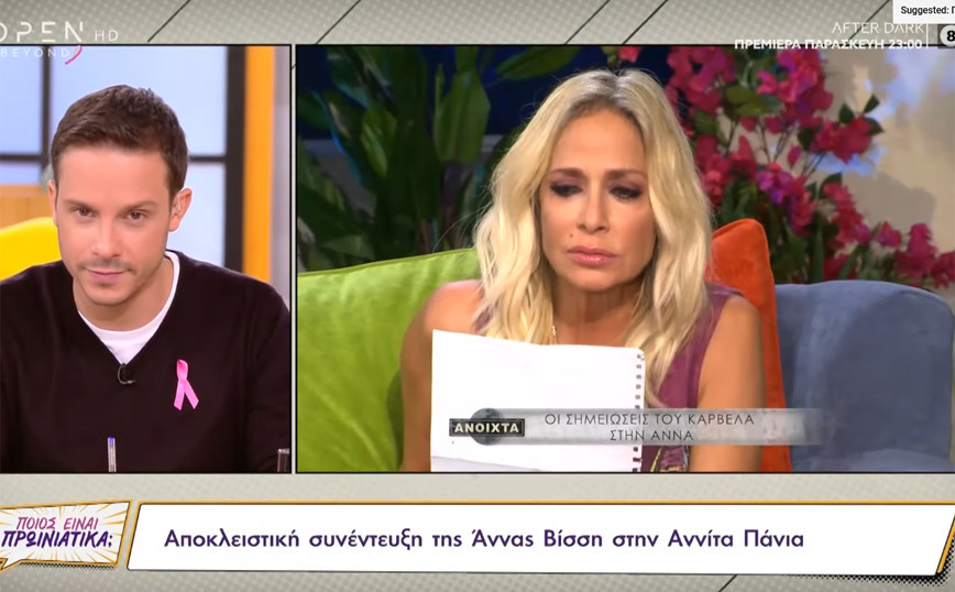 Ξέσπασε σε κλάματα η Άννα Βίσση διαβάζοντας ένα γράμμα του Νίκου Καρβέλα στην εκπομπή της Αννίτας Πάνια που αναμένεται να κάνει πρεμιέρα αύριο, Παρασκευή, στο Open. «Εγώ παντρεύτηκα τον Νίκο Καρβέλα και την Άννα Βίσση μαζί. Χώρισα από τον Καρβέλα αλλά από τη Βίσση δεν έχω χωρίσει» είπε αρχικά η Αννίτα Πάνια, με την Άννα Βίσση να ξεσπάει σε γέλια.