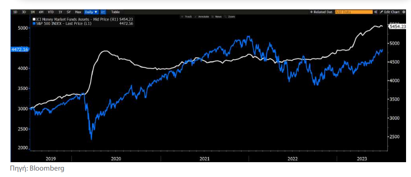 Έρχονται όμως με ένα κόστος. Την αποχή από τις αγορές οι οποίες σε κάθε περίπτωση αποδίδουν 9% το χρόνο. Και όταν οι αποδόσεις των money market funds ξεκινήσουν να πέφτουν (σύντομα), τότε οι διαχειριστές θα στραφούν εκ νέου στις μετοχές στηρίζοντας υψηλότερες αποτιμήσεις.