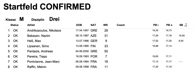 Εκτός από τους δύο Έλληνες άλτες, συμμετέχουν άλλοι έξι αθλητές με τον Γερμανό Μαξ Χες και τον Αζέρο Ναζίμ Μπαμπάεφ να ξεχωρίζουν έχοντας 17.52μ και 17.29μ αντίστοιχα στον κλειστό. Στον αγώνα δηλώθηκαν και οι Γάλλοι Ζαν Μαρκ Ποντβιάν (17.13μ) και Μέλβιν Ραφέν (17.20μ) καθώς και ο Πορτογάλος Τιάγκο Περέιρα (16.65μ) με τον Φινλανδό Σίμο Λίψανεν (16.98μ).