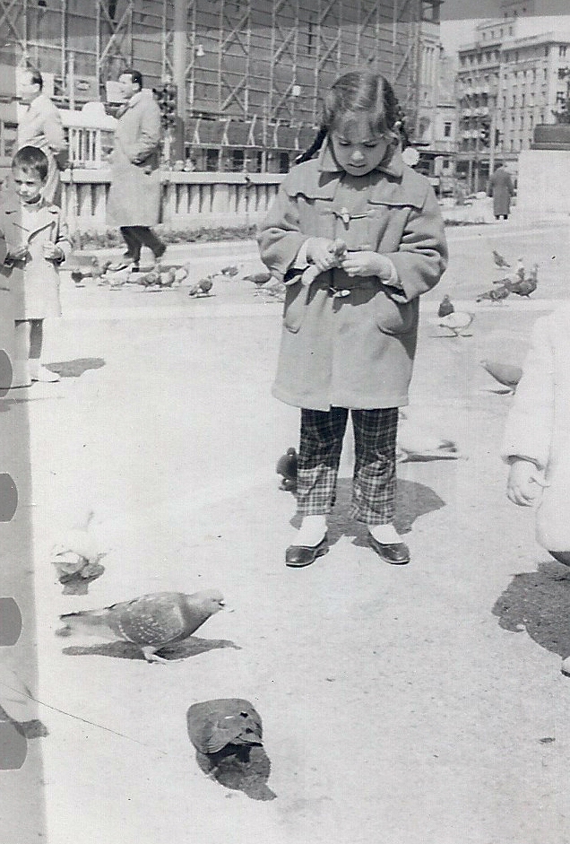 ΑΘΗΝΑ, Πλατεία Συντάγματος. Κοριτσάκι και περιστέρια. Γύρω, άλλα παιδιά και μεγάλοι με τα χειμωνιάτικα, αν και η ημέρα ήταν ηλιόλουστη. Η λήψη ήταν κακή, στις δυο άκρες διακρίνεται αποτύπωμα το φιλμ.