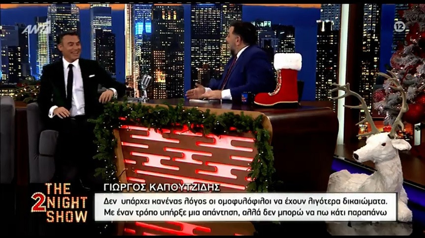 Φυσικά, ο οικοδεσπότης ζήτησε από τον Γιώργο Καπουτζίδη πολλάκις να επιχειρήσει να λύσει τις όποιες διαφορές του είτε στον Νίκο Μουτσινά, είτε με την Ελένη Γερασιμίδου, είτε ακόμα και με τον πρωθυπουργό αλλά οι απαντήσεις που πήρε ήταν όλες αρνητικές. Έτσι, ο Γρηγόρης Αρναούτογλου βρήκε τη λύση λίγο πριν από το τέλος της συνέντευξης…
