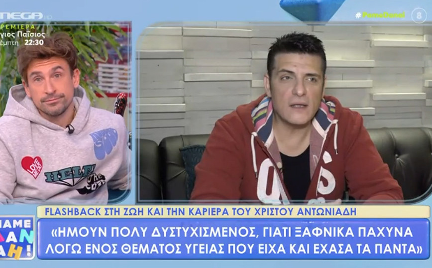«Ήμουν πολύ δυστυχισμένος, γιατί ξαφνικά πάχυνα λόγω ενός θέματος υγείας που είχα και έχασα τα πάντα» εξομολογήθηκε ο Χρίστος Αντωνιάδης στην κάμερα του «Πάμε Δανάη» ενώ τόνισε πως η δισκογραφική του εταιρεία του είχε πει: «Πρέπει να επιλέξεις, ή καριέρα ή κιλά».