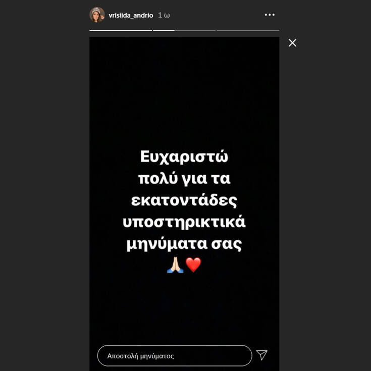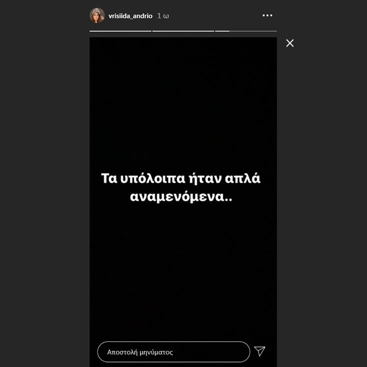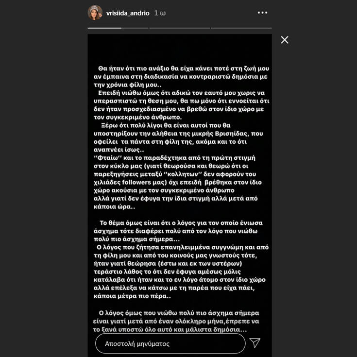 Ξέρω ότι πολλοί λίγοι θα είναι αυτοί που θα υποστηρίξουν την αλήθεια της μικρής Βρισηίδας, που οφείλει τα πάντα στη φίλη της, ακόμη και το ότι αναπνέει ίσως… “Φταίω” και το παραδέχτηκα από την πρώτη στιγμή στον κύκλο μας», έγραψε μεταξύ άλλων η Βρισηίδα Ανδριώτου και ευχαρίστησε όλους όσοι της έστειλαν μηνύματα υποστήριξης.
