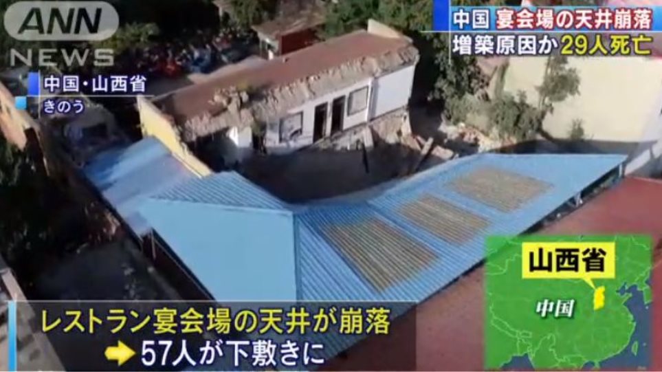 Η τραγωδία εκτυλίχθηκε χθες το πρωί στην πόλη Σιανγκφέν της επαρχίας Σανσί στη βόρεια Κίνα, την ώρα που ένας 80χρονος γιόρταζε τα γενέθλιά του στο εστιατόριο, μετέδωσε το πρακτορείο Xinhua, επικαλούμενο τις τοπικές αρχές.