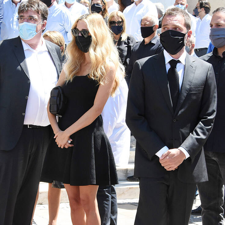 Εκεί ήταν και τα δύο του παιδιά, Θεόδωρος και Δημήτρης, ο οποίος συνοδευόταν από την σύζυγό του, Δούκισσα Νομικού. Ντυμένη στα μαύρα φορώντας ασορτί μάσκα προστασίας, η παρουσιάστρια αποχαιρέτισε συγκινημένη τον πεθερό της.