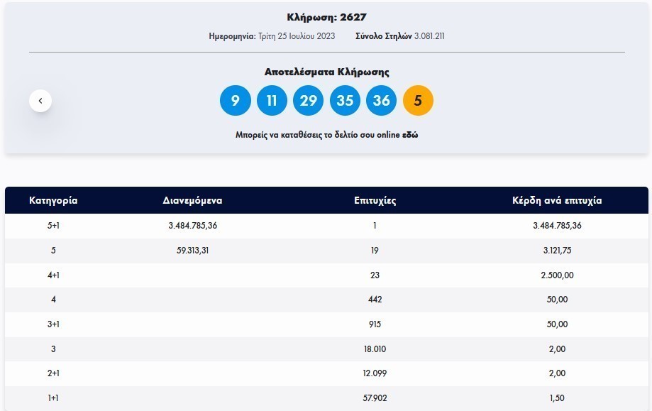 Oλοκληρώθηκε η κλήρωση του Τζόκερ που πραγματοποιήθηκε την Τρίτη, 25 Ιουλίου 2023 και μοίραζε €3.400.000 στους νικητές της πρώτης κατηγορίας.