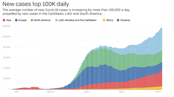 Σύμφωνα με τα δεδομένα του πανεπιστημίου Johns Hopkins στις 3 Ιουνίου σημειώθηκε νέο ρεκόρ, 130.400 κρουσμάτων σε μία ημέρα.