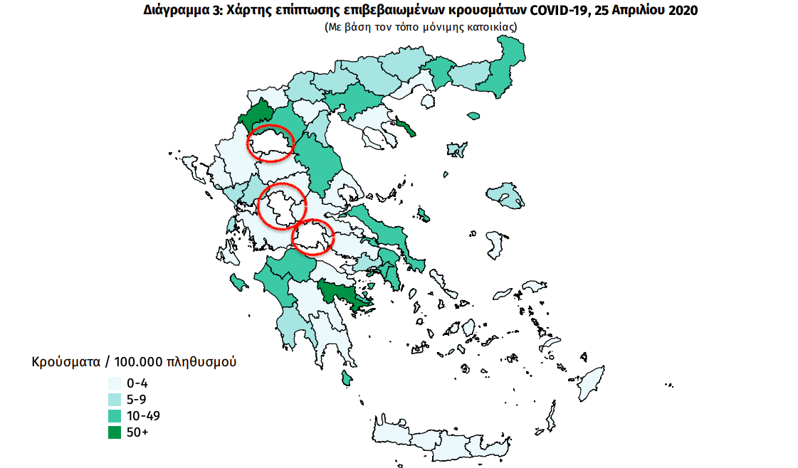 Την εξάπλωση του κορωνοϊού στην Ελλάδα αποτυπώνει η νέα «Ημερήσια έκθεση» του ΕΟΔΥ που δημοσιεύθηκε το Σάββατο 25 Απριλίου. Ποιοι νομοί της Ελλάδας δεν έχουν κανένα κρούσμα και ποιοι έχουν τα περισσότερα.