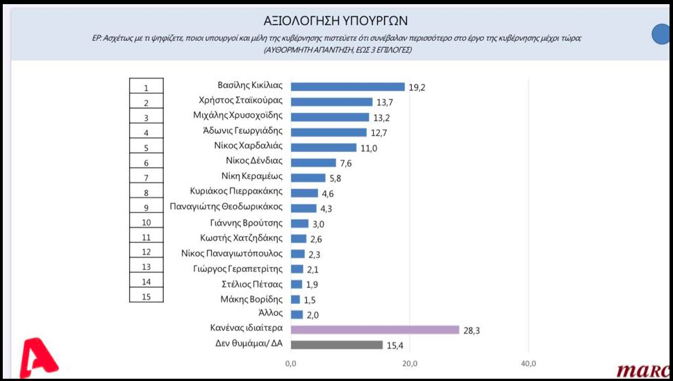 Σύμφωνα με τη δημοσκόπηση της εταιρίας MARC για λογαριασμό του ALPHA στην ερώτηση “Ασχέτως με τι ψηφίζετε, ποιοι υπουργοί και μέλη της κυβέρνηση πιστεύετε ότι συνέβαλαν περισσότερο στο έργο της κυβέρνησης μέχρι τώρα;“, ο υπουργός Υγείας Βασίλης Κικίλιας βρίσκεται στην πρώτη θέση, συγκεντρώνοντας το 19,2 των προτιμήσεων.
