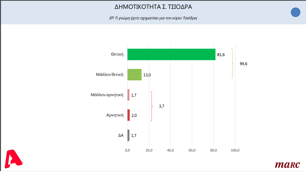 Σε ερώτηση “τι γνώμη έχετε σχηματίσει για τον κύριο Τσίοδρα;“, οι θετικές απαντήσεις συγκεντρώνουν το 94,6%, ενώ οι αρνητικές γνώμες αγγίζουν μόλις το 3,7%. Θετικότατη είναι η άποψη τωμ πολιτών και για τον Νίκο Χαρδαλιά με το ποσοστό των θετικών απαντήσεων να φτάνει το 84,3%.