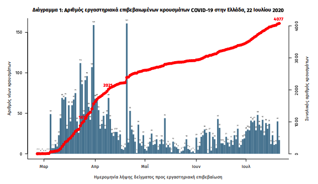 Δείγματα που έχουν ελεγχθεί στα συνεργαζόμενα με τον ΕΟΔΥ εργαστήρια: Από την 1η Ιανουαρίου 2020 μέχρι σήμερα, στα εργαστήρια που διενεργούν ελέγχους για τον νέο κορωνοϊό (SARS-CoV-2) και που δηλώνουν συστηματικά στον ΕΟΔΥ το σύνολο των δειγμάτων που ελέγχουν (θετικά και αρνητικά), έχουν συνολικά ελεγχθεί 424675 κλινικά δείγματα, εκ των οποίων τα 6238 (1.5%) ήταν θετικά στον κορωνοϊό (συμπεριλαμβάνονται και περισσότερα από ένα δείγματα ανά άτομο που ελέγχθηκε).