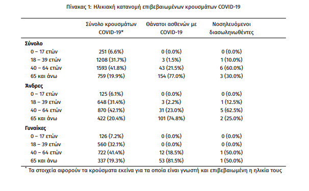 Η ηλικιακή κατανομή των (α) συνολικών κρουσμάτων, (β) των περιστατικών που κατέληξαν σε θάνατο και (γ) των ασθενών που νοσηλεύονται διασωληνωμένοι, είναι η ακόλουθη:
