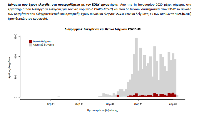 Συγκεκριμένα, από τα 22.437 κλινικά δείγματα τα οποία εξετάστηκαν συνολικά από την αρχή της καταγραφής της πανδημίας στη χώρα μας και μέχρι χθες, τα 1.524 ήταν θετικά στον κορωνοϊό, ποσοστό δηλαδή που φτάνει το 6,8%.