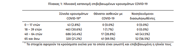 Στην Ελλάδα, σταθερό προβάδισμα κάθε εβδομάδα στην ηλικιακή ομάδα των νοσούντων έχουν οι ηλικίες από 40-64 ετών, ενώ στους θανάτους και στις εισαγωγές σε ΜΕΘ, οι νοσούντες άνω των 65 ετών.