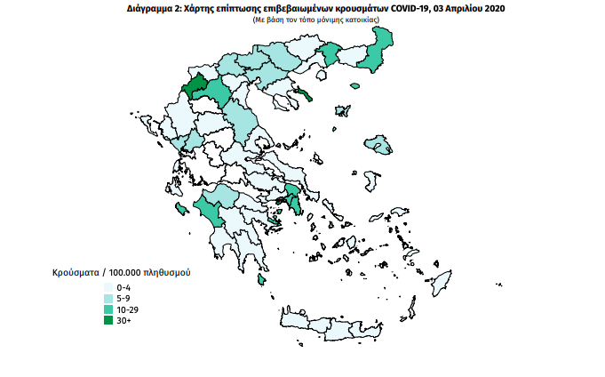 Ωστόσο, σε περιοχές, όπως η Δυτική Μακεδονία και κυρίως η Καστοριά, εμφανίζεται η μεγαλύτερη αναλογία νοσούντων ανά 100.000 κατοίκων. Ακολουθεί με μικρότερη αναλογία κρουσμάτων / 100.000 πληθυσμού, η Κοζάνη, η Ζάκυνθος, η Ανατολική Αττική, ο Έβρος και η Ξάνθη.