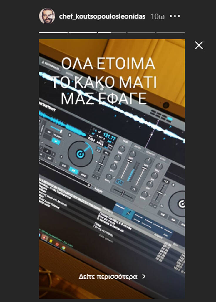 Έτσι, «Μένει Σπίτι», όπως συστήνουν οι οδηγίες των Αρχών και ξεκίνησε τη δική του ραδιοφωνική εκπομπή στο διαδίκτυο. Ο Λεωνίδας Κουτσόπουλος επιλέγει αγαπημένα τραγούδια και με τον τρόπο αυτό, κρατάει συντροφιά στους διαδικτυακούς του φίλους.