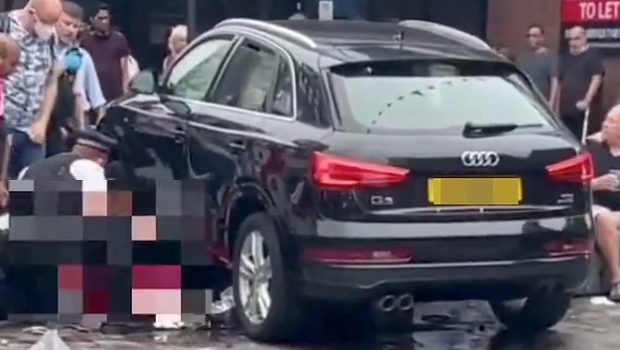 Σε βίντεο από τη στιγμή του συμβάντος φαίνεται το μαύρο όχημα σφηνωμένο πάνω σε ένα κολωνάκι, ενώ αστυνομικοί περιθάλπουν ένα άτομο που φαίνεται να έχει παγιδευτεί από κάτω.