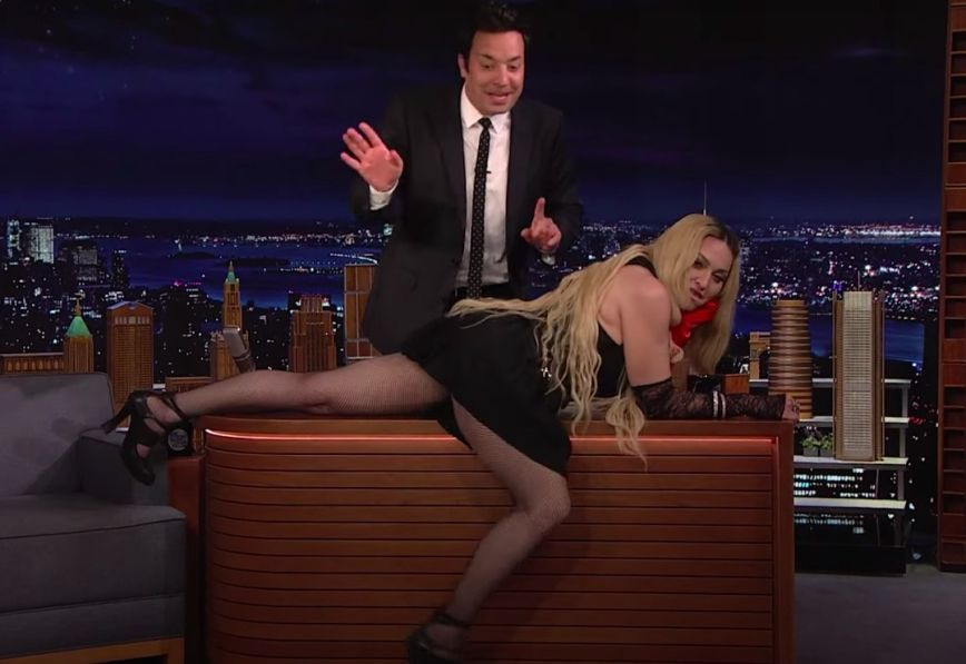 Ξέφυγε η Μαντόνα: Ξάπλωσε στο γραφείο του Τζίμι Φάλον και σήκωσε τη φούστα της