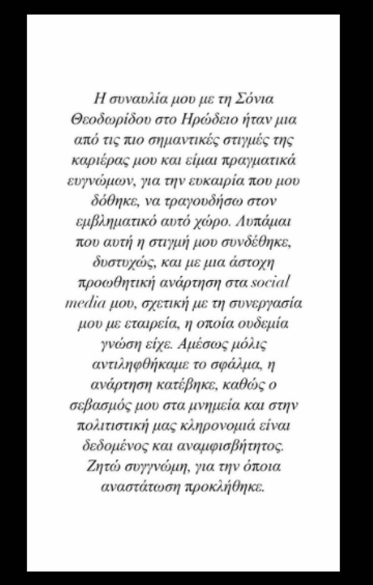«Η συναυλία μου με τη Σόνια Θεοδωρίδου στο Ηρώδειο ήταν μια από τις πιο σημαντικές στιγμές της καριέρας μου και είμαι πραγματικά ευγνώμων, για την ευκαιρία που μου δόθηκε, να τραγουδήσω στον εμβληματικό αυτό χώρο. Λυπάμαι που αυτή η στιγμή μου συνδέθηκε, δυστυχώς, και με μία άστοχη προωθητική ανάρτηση στα social media μου, σχετική με τη συνεργασία μου με εταιρεία, η οποία ουδεμία γνώση είχε.