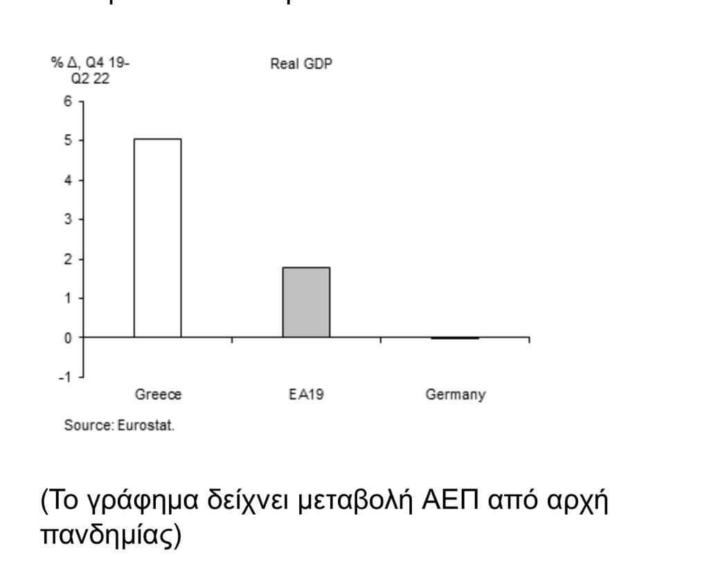 Αναλυτικώς “στο πρώτο γράφημα απεικονίζεται η μεγέθυνση του εθνικού εισοδήματος από το τελευταίο τρίμηνο του 2019 έως το πρώτο εξάμηνο του 2022. Παρά την παγκόσμια και εθνική ύφεση που προκάλεσαν η πανδημία και τα lockdown, η ελληνική οικονομία κατάφερε να μεγεθυνθεί σωρευτικά τους τελευταίους 33 μήνες κατά 5 μονάδες. Σύμφωνα με το προσχέδιο του προϋπολογισμού του 2023 που κατατέθηκε αυτή την εβδομάδα στη Βουλή, το ΑΕΠ εκτιμάται ότι θα φτάσει τα 210 δισ. ευρώ το 2022 από 183 δισ. ευρώ το 2019. Την ίδια περίοδο η ευρωζώνη παρουσιάζει υποδιπλάσιο ρυθμό ανάπτυξης, η δε Γερμανία σχεδόν μηδενικό”.