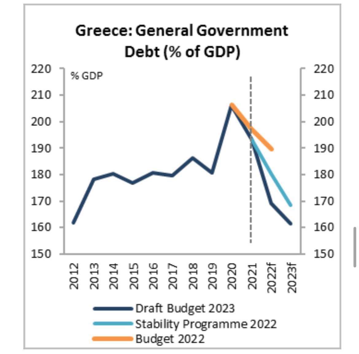 Ενώ στο δεύτερο γράφημα “απεικονίζεται η ραγδαία αποκλιμάκωση του δημοσίου χρέους μετά την πρόσκαιρη αύξησή του 2020 όταν το κράτος έγινε αναπόφευκτα ο εργοδότης σχεδόν όλης της οικονομίας κατά τη διάρκεια των lockdown. Και πάλι σύμφωνα με το προσχέδιο του προϋπολογισμού του 2023, το χρέος της Γενικής Κυβέρνησης εκτιμάται ότι θα διαμορφωθεί στα 355.000 εκατ. ευρώ ή 169,1% ως ποσοστό του ΑΕΠ στο τέλος του 2022, έναντι 353.389 εκατ. ευρώ ή 193,3% ως ποσοστό του ΑΕΠ το 2021, παρουσιάζοντας μείωση κατά 24,2 (!!!) ποσοστιαίες μονάδες έναντι του 2021.