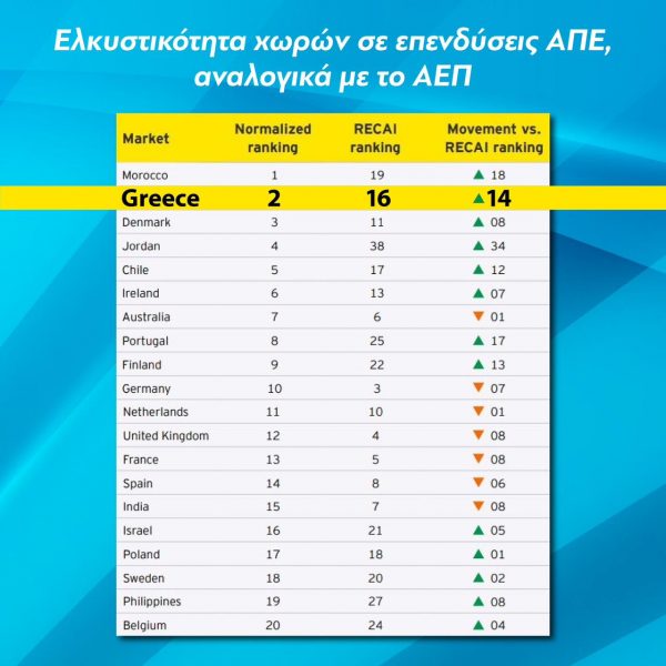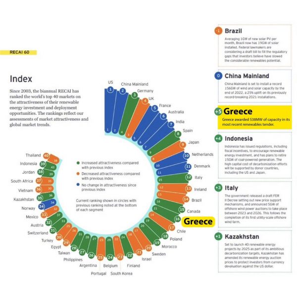 Επίσης, η Ελλάδα βρίσκεται στην 16η θέση στον γενικό δείκτη ελκυστικότητας επενδύσεων σε ΑΠΕ, μεταξύ 40 κορυφαίων οικονομιών του κόσμου, σημειώνοντας άνοδο πέντε θέσεων (από την 21η στην 16η θέση) από την έκδοση του Απριλίου. Η 16η θέση είναι η υψηλότερη που έχει καταλάβει η Ελλάδα στην τριακονταετή ιστορία του δείκτη.
