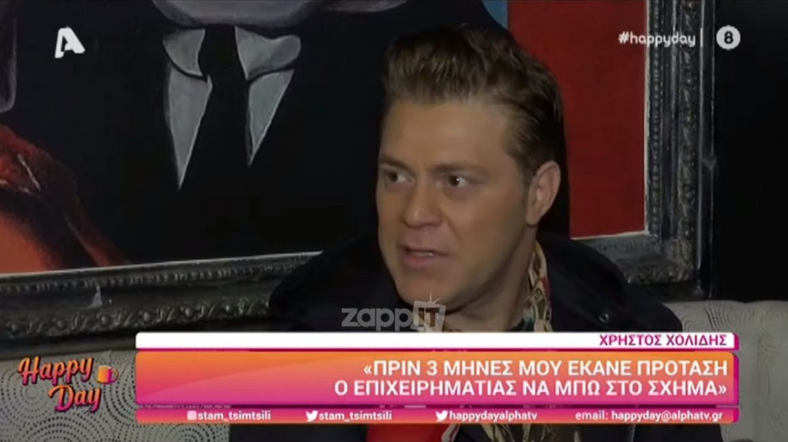 Θα έπαιρνε μέρος σε κάποιο talent show ο Χρήστος Χολίδης, ως μέλος τη κριτικής επιτροπής; Η απάντηση του καταφατική και όχι μόνο… «Ναι, θα ήθελα και cameraman αν θέλετε στην παραγωγή αντέχω ακόμα, να κουβαλάω κιβώτια, ό,τι θέλετε, κάμερες…» είπε ο τραγουδιστής στην κάμερα της εκπομπής «Happy Day» το πρωί της Πέμπτης (24/03).