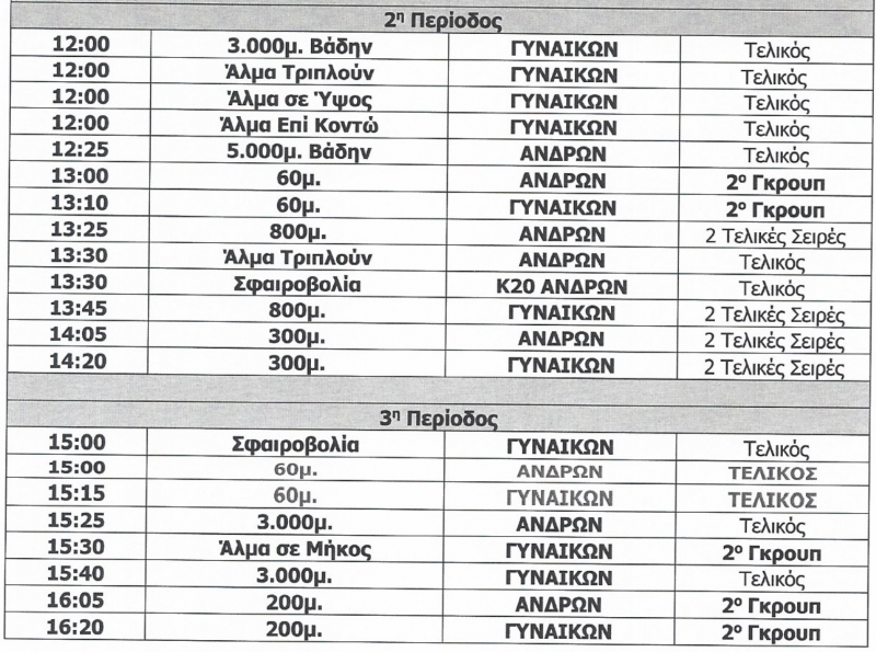Δρομικά: 60μ – 200μ – 300μ – 400μ – 800μ – 1.500μ – 3.000μ – 60μ εμπόδια – 3.000μ βάδην (γυναικών) – 5.000μ βάδην (ανδρών)