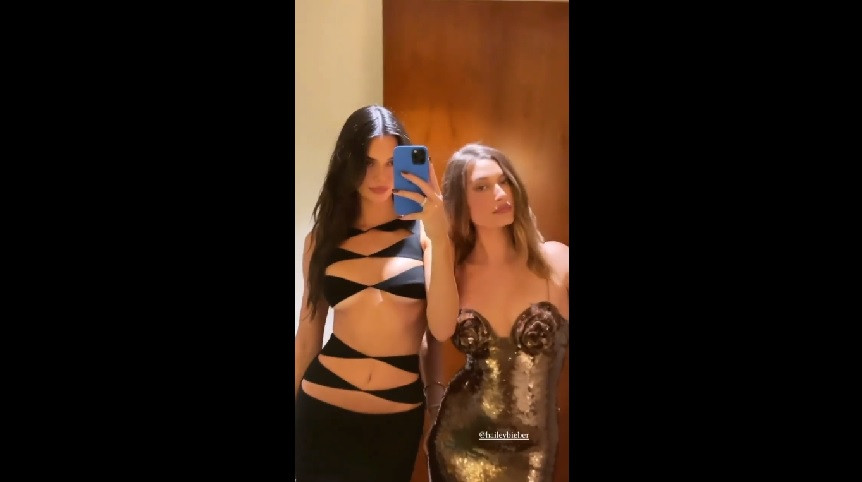 Ποζάροντας με τις φίλες της στο πάρτι, συμπεριλαμβανομένων των Hailey Bieber και Bella Hadid, η Jenner τράβηξε μια σειρά από selfies τουαλέτας, δείχνοντας το φόρεμα από διαφορετικές οπτικές γωνίες.