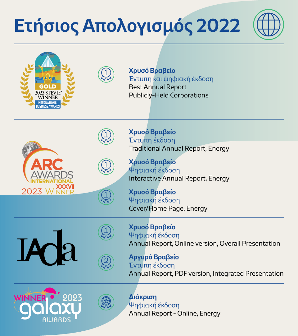 Τόσο ο έντυπος όσο και ο ψηφιακός Ετήσιος Απολογισμός 2022 – Empowering Tomorrow, απέσπασαν τα εξής βραβεία (6) και διακρίσεις (1):