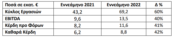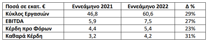 - Αύξηση των Κερδών προ Φόρων Τόκων και Αποσβέσεων (EBITDA) κατά 40% στα € 13,5 εκατ.