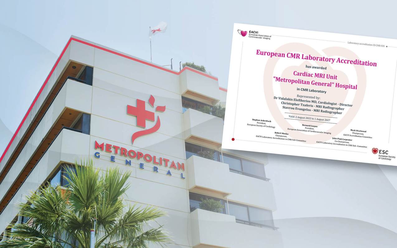 Πιστοποίηση από την Ευρωπαϊκή Εταιρεία Καρδιαγγειακής Απεικόνισης (EACVI) έλαβε το Τμήμα Μαγνητικής Τομογραφίας Καρδιάς του θεραπευτηρίου Metropolitan General. Πλέον αποτελεί ένα από τα δύο τμήματα στην Ελλάδα και ένα από τα 25 παγκοσμίως που κατέχουν αυτή τη διάκριση.